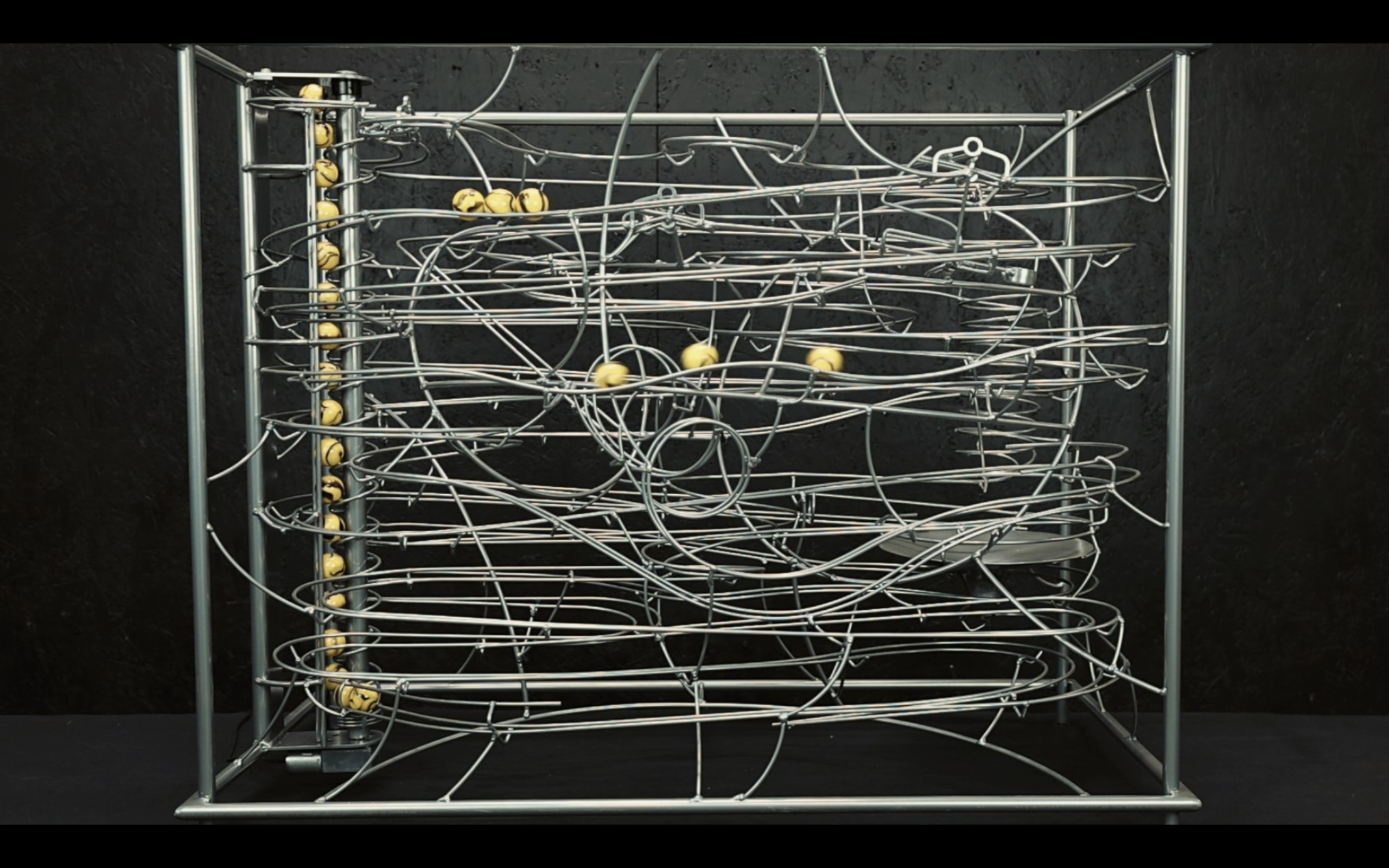 A rolling ball sculpture is a series of tracks where a marble or ball makes it's way along, through, over, under, around and down the sculpture. Along it's path the marbles pass through 'track components' which either slow, speed up, or purely entertain the user. Track components for example may include loops or tipping arms.