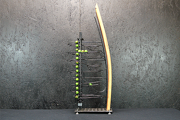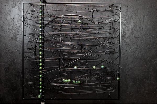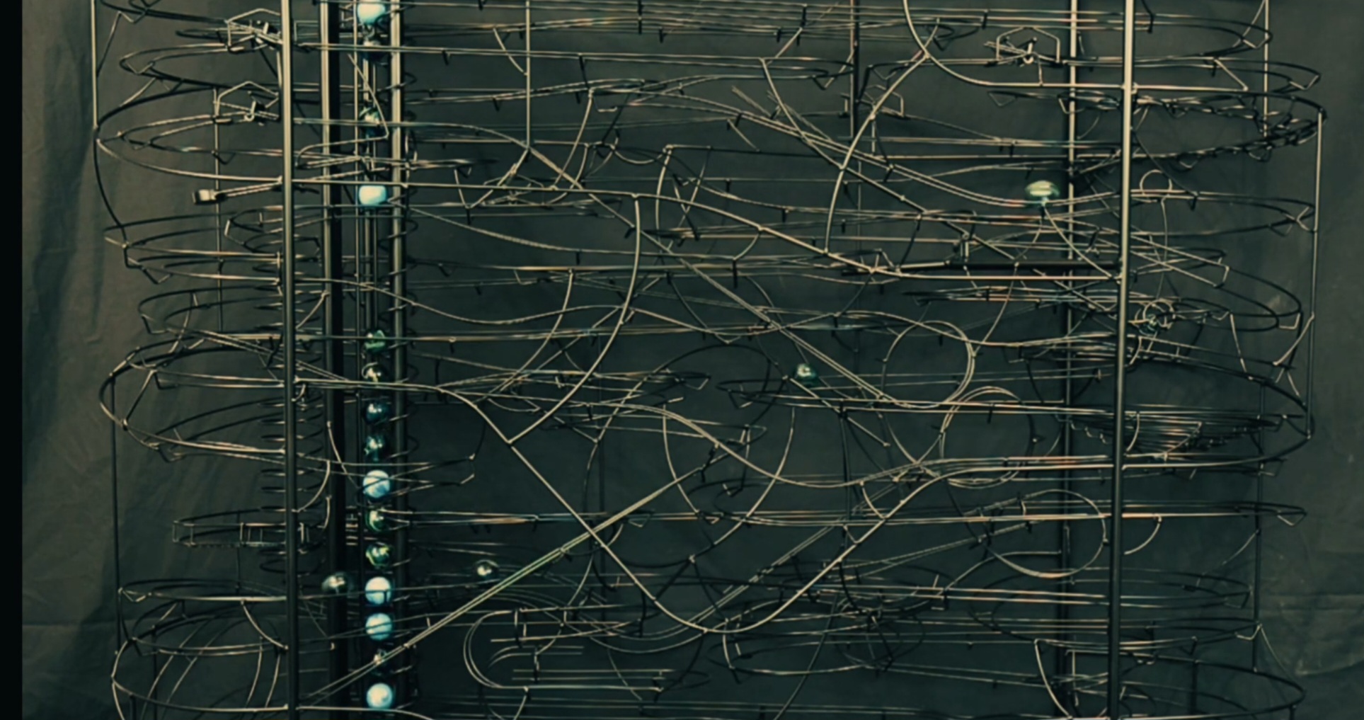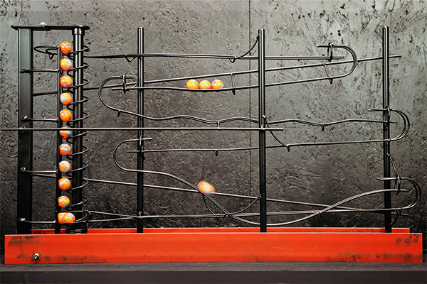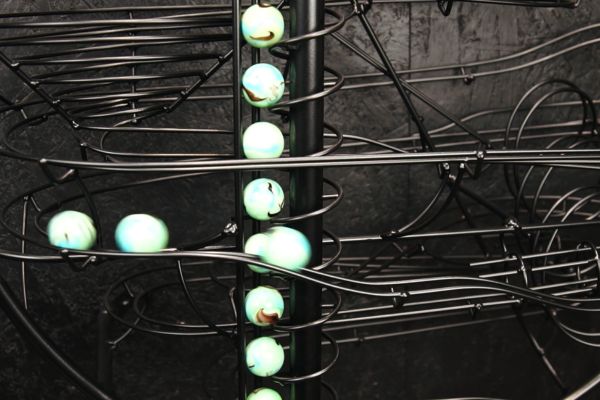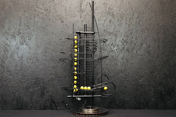 A rolling ball sculpture is a series of tracks where a marble or ball makes it's way along, through, over, under, around and down the sculpture. Along it's path the marbles pass through 'track components' which either slow, speed up, or purely entertain the user. Track components for example may include loops or tipping arms.